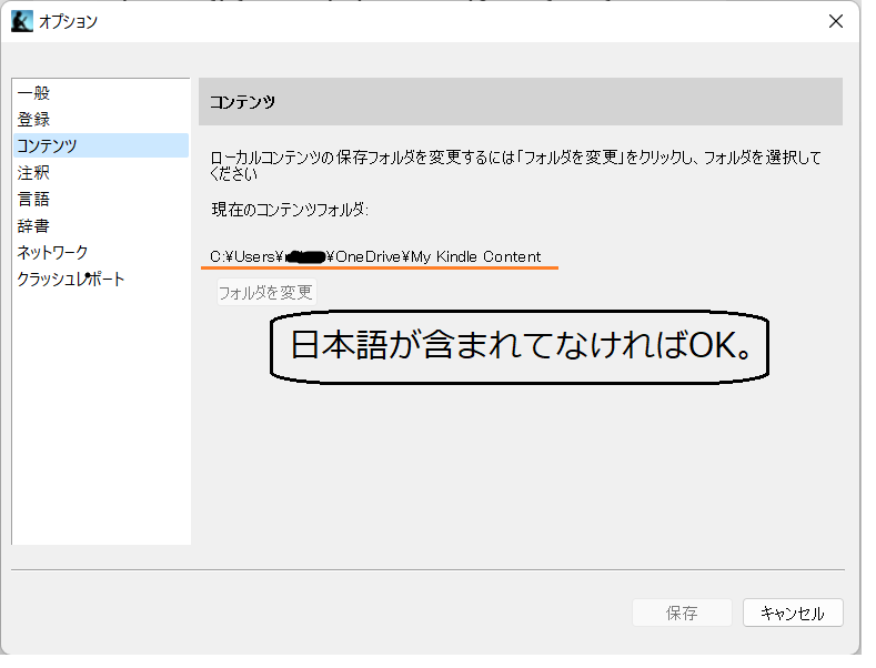 簡単に言うと、Kindleのコンテンツの保存フォルダのパスの中に、日本語が入っているのがダメらしいです。保存フォルダのパスが英数字だけになるようにすればOK。やり方は下記をご参照ください。