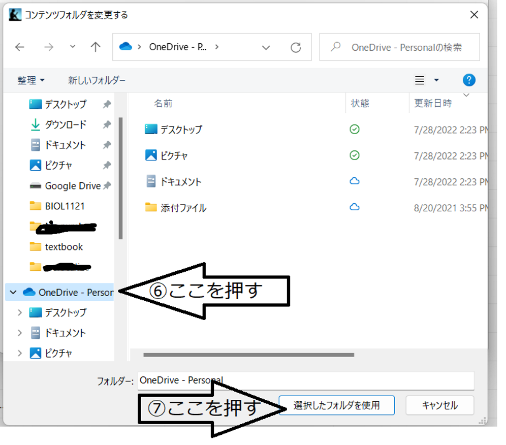 すると新しいウインドウが出てくるので、そこで左側にある⑥「One Drive – Personal」を押して、⑦「選択したフォルダを使用」を押します。(パスに日本語が含まれていなければ、違うフォルダを選択してもOKだそうです。)