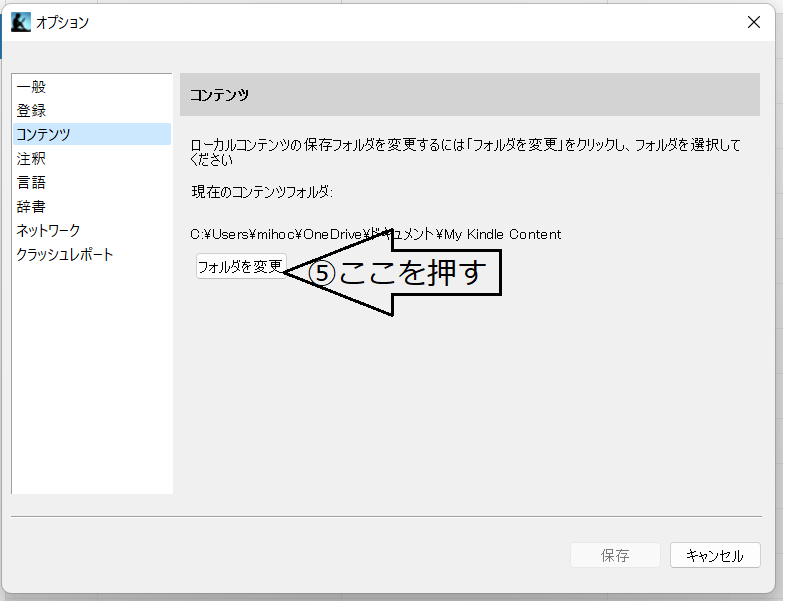 先ほどの画面(ツール>オプション>コンテンツ)にある、⑤「フォルダを変更」ボタンを押します。